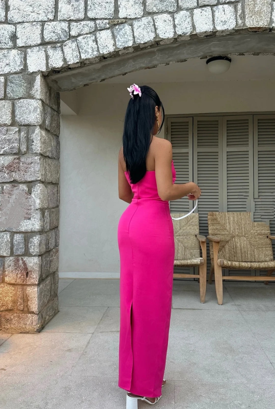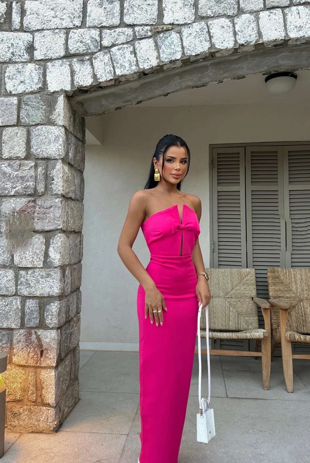 Εντυπωσιάστε με έντονο χρώμα και θηλυκή κομψότητα. Αυτό το φούξια strapless φόρεμα ξεχωρίζει με το structured μπούστο του, που διαθέτει λεπτή διαφάνεια και διακοσμητικό φιόγκο στο κέντρο. Η στενή γραμμή αναδεικνύει τη σιλουέτα, ενώ το μήκος του χαρίζει μοντέρνα φινέτσα. Ιδανική επιλογή για γάμους, πάρτι ή καλοκαιρινά events.