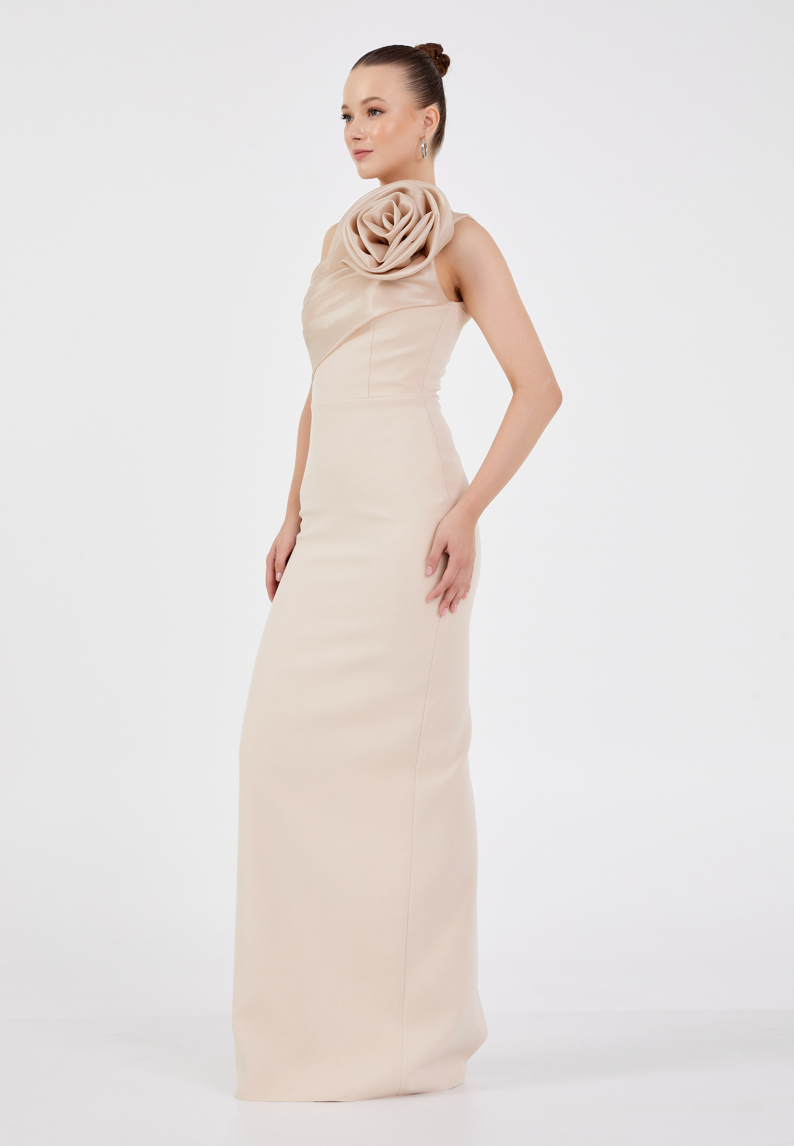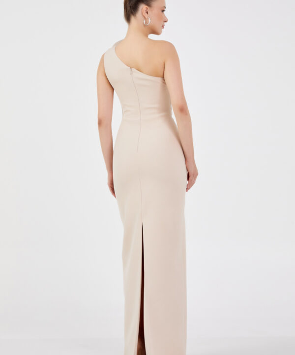 Μακρύ Μπεζ Φόρεμα Με έναν Ώμος και Διακοσμητικό Λουλούδι