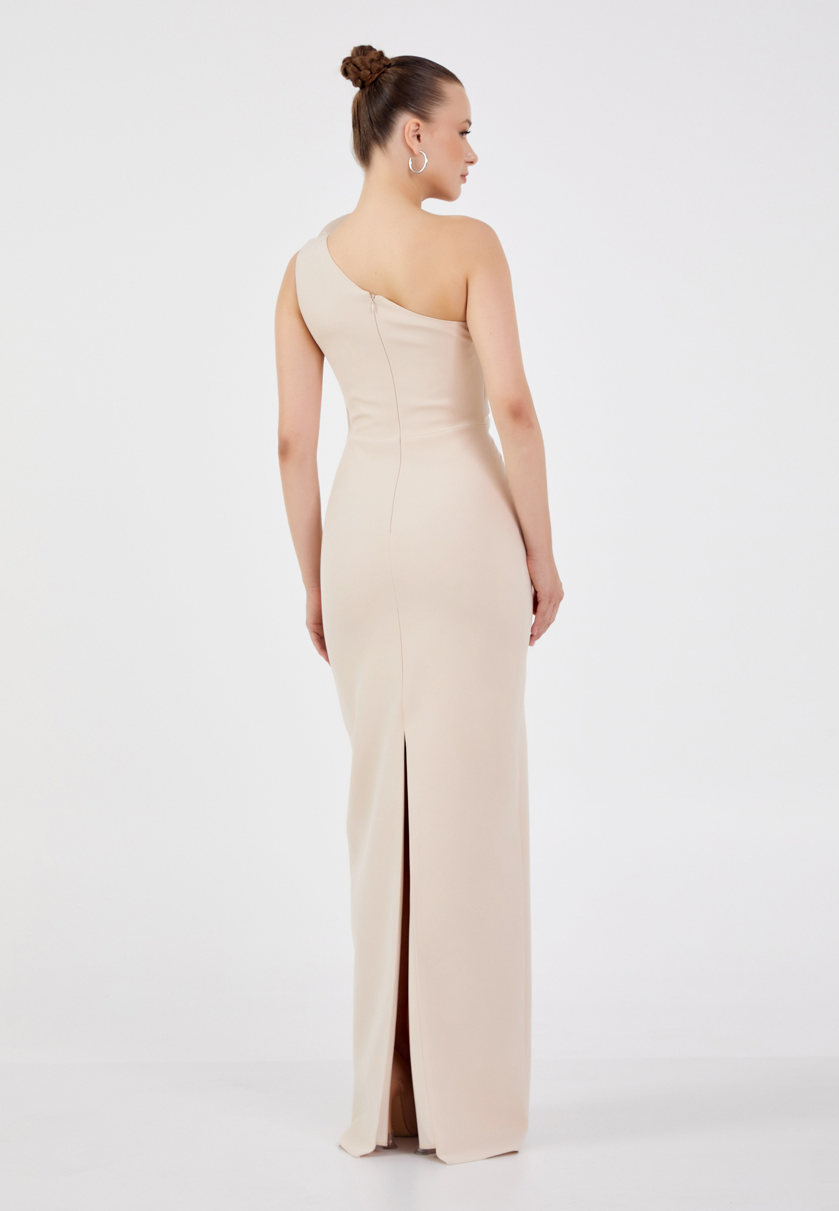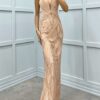 Αναδείξτε τη θηλυκότητά σας με αυτό το εντυπωσιακό μακρύ φόρεμα σε απόχρωση του μπεζ.