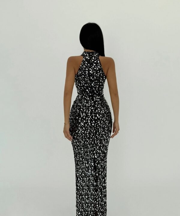 Το μαύρο του ύφασμα καλύπτεται από εντυπωσιακές, oversized ασημί παγιέτες που αιχμαλωτίζουν το φως σε κάθε σας κίνηση. Διαθέτει halter λαιμόκοψη που δένει κομψά στον λαιμό και εφαρμοστή γραμμή που αγκαλιάζει τη σιλουέτα. Ιδανική επιλογή για επίσημες εμφανίσεις ή βραδινές εξόδους με έντονη προσωπικότητα.