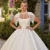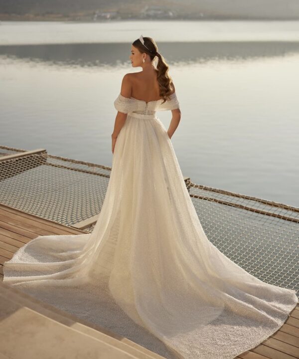 Το πλισέ ντεκολτέ με off-shoulder μανίκια χαρίζει ρομαντισμό και φινέτσα, ενώ η αποσπώμενη φούστα με ουρά δίνει τη δυνατότητα για δύο εντυπωσιακές bridal εμφανίσεις. Ιδανικό για τη νύφη που θέλει να συνδυάσει την κομψότητα με τη λειτουργικότητα.