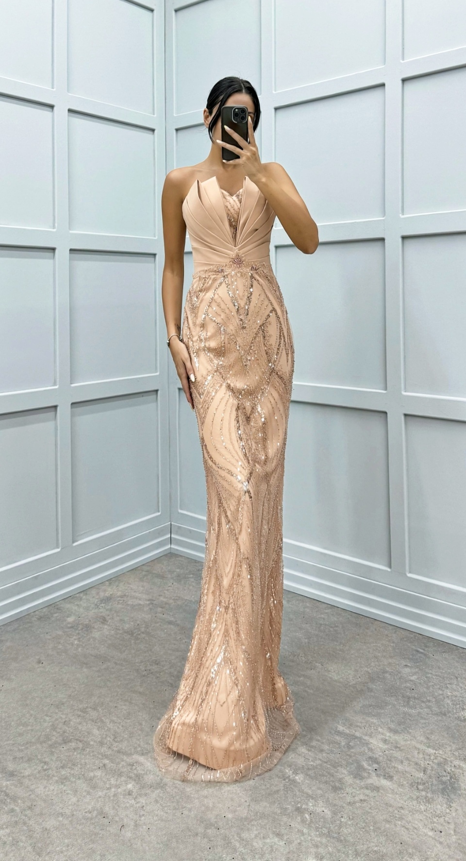 Μαγνήτισε τα βλέμματα με αυτό το εντυπωσιακό βραδινό φόρεμα σε nude champagne απόχρωση.